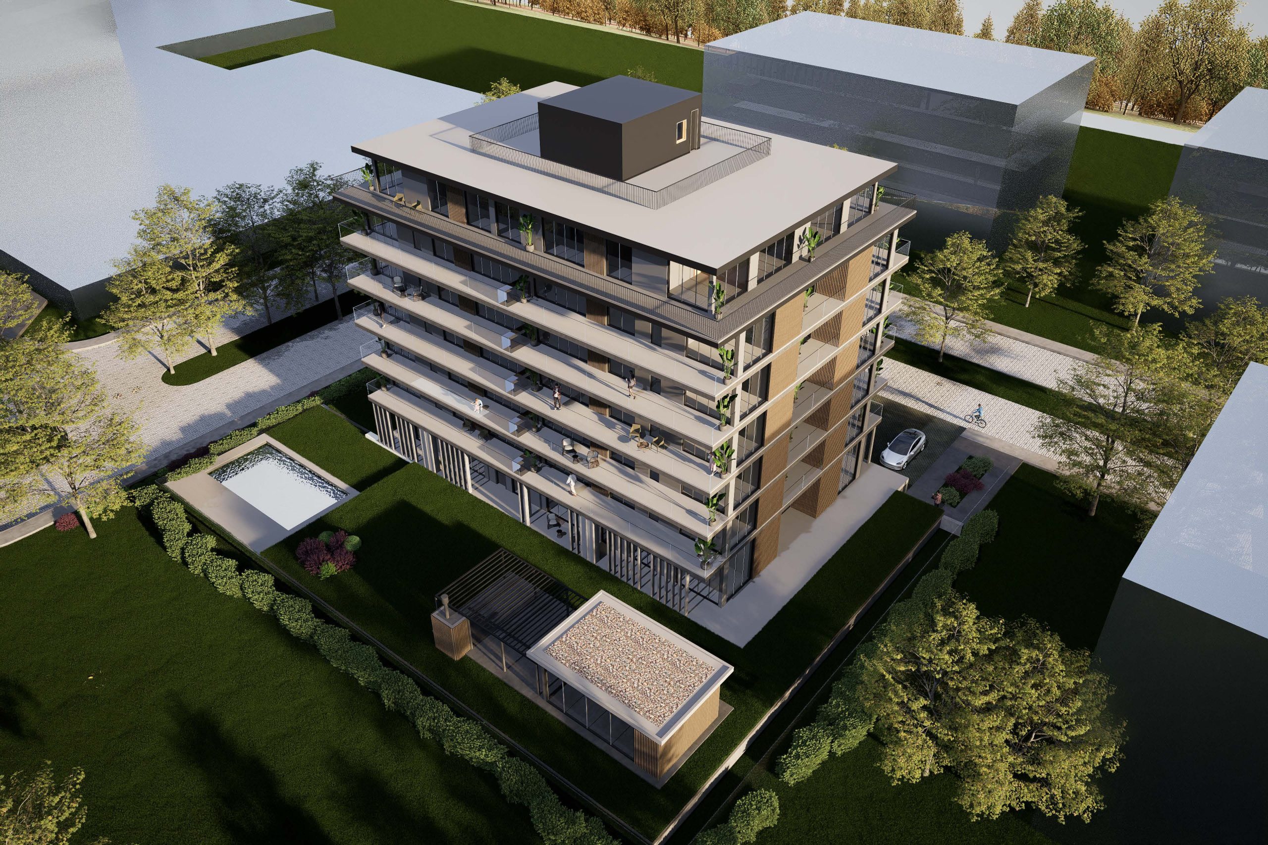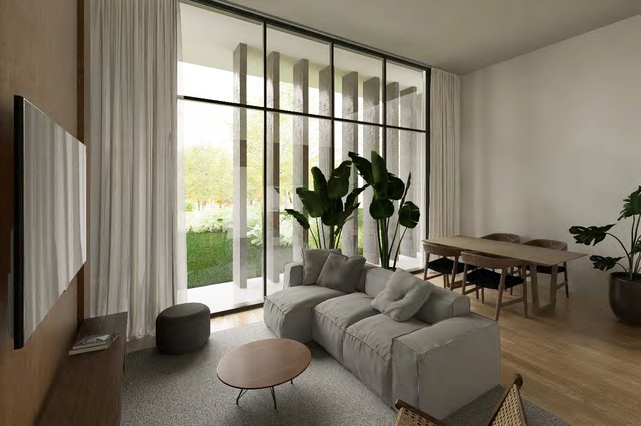 Este edificio de departamentos se integra a un masterplan destacado, rodeado de otros edificios residenciales, y cuenta con SUM, piscina y 66 cocheras en subsuelo, además de acceso directo a un centro comercial propio.